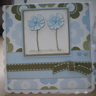 Woodware kraft card, Bo Bunny papers, Bazzill bling card stock( but didn't realise I'd put it around the wrong way-doh!), SU-Old Olive card & punch, button from stash, Nestabilities scalloped rectangle, Kaisercraft pearls & water colour pencils.